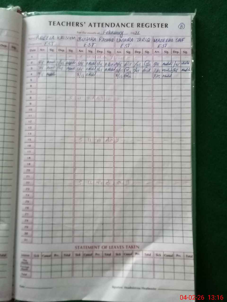 | Leave | Duty | Absent | Maternity | Medical | Ex- Pak |