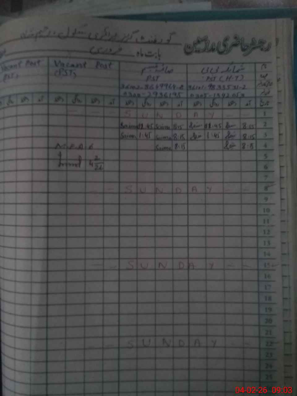 | CNIC | Full Name | Designation | R/C | Absence During Last Calender Month |