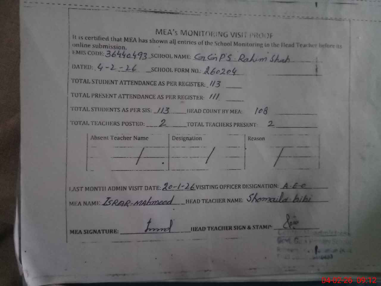 | Attendance Register | Head Teacher | MEA with School | Visit Proof |