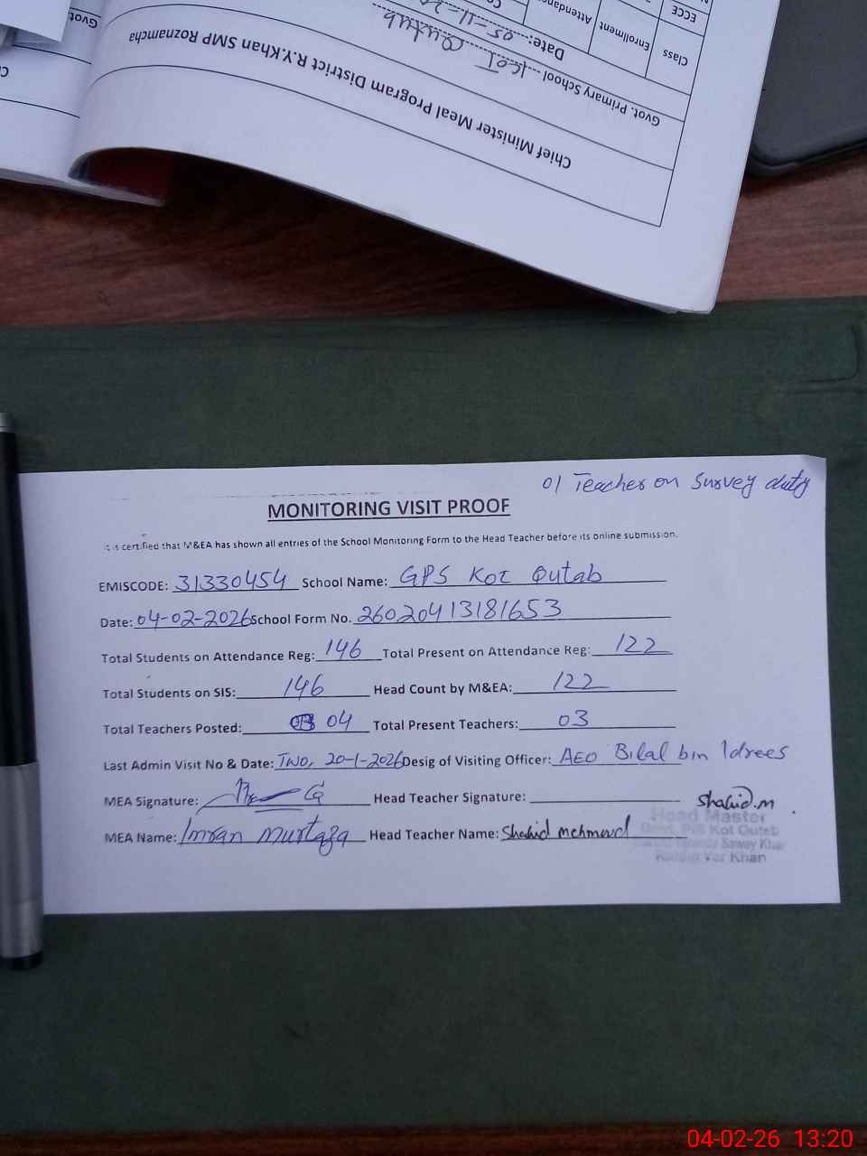 | EMIS Code: 31330454 | Name of School: GPS KOT QUATAB | |||
