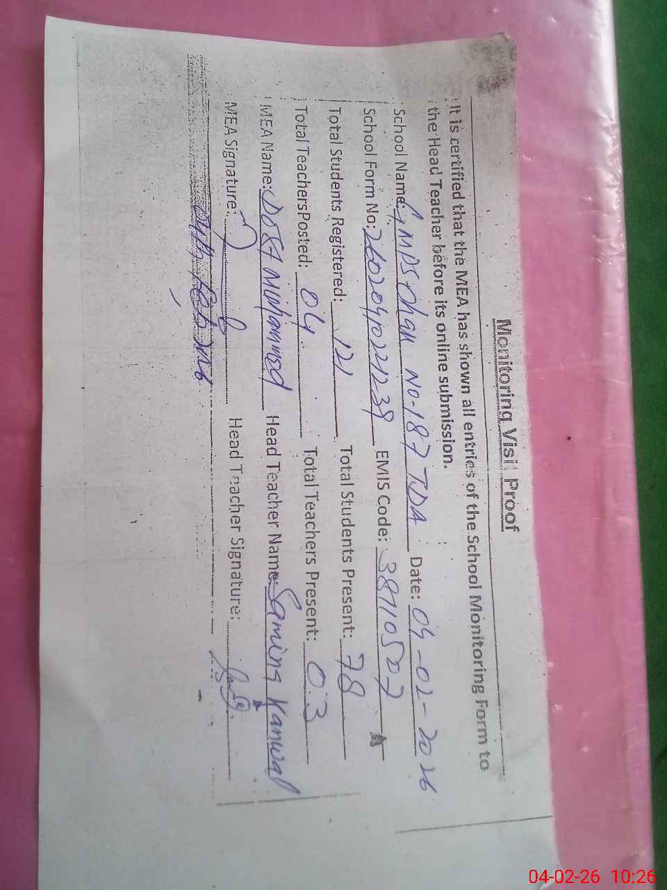 | Attendance Register | Head Teacher | MEA with School | Visit Proof |