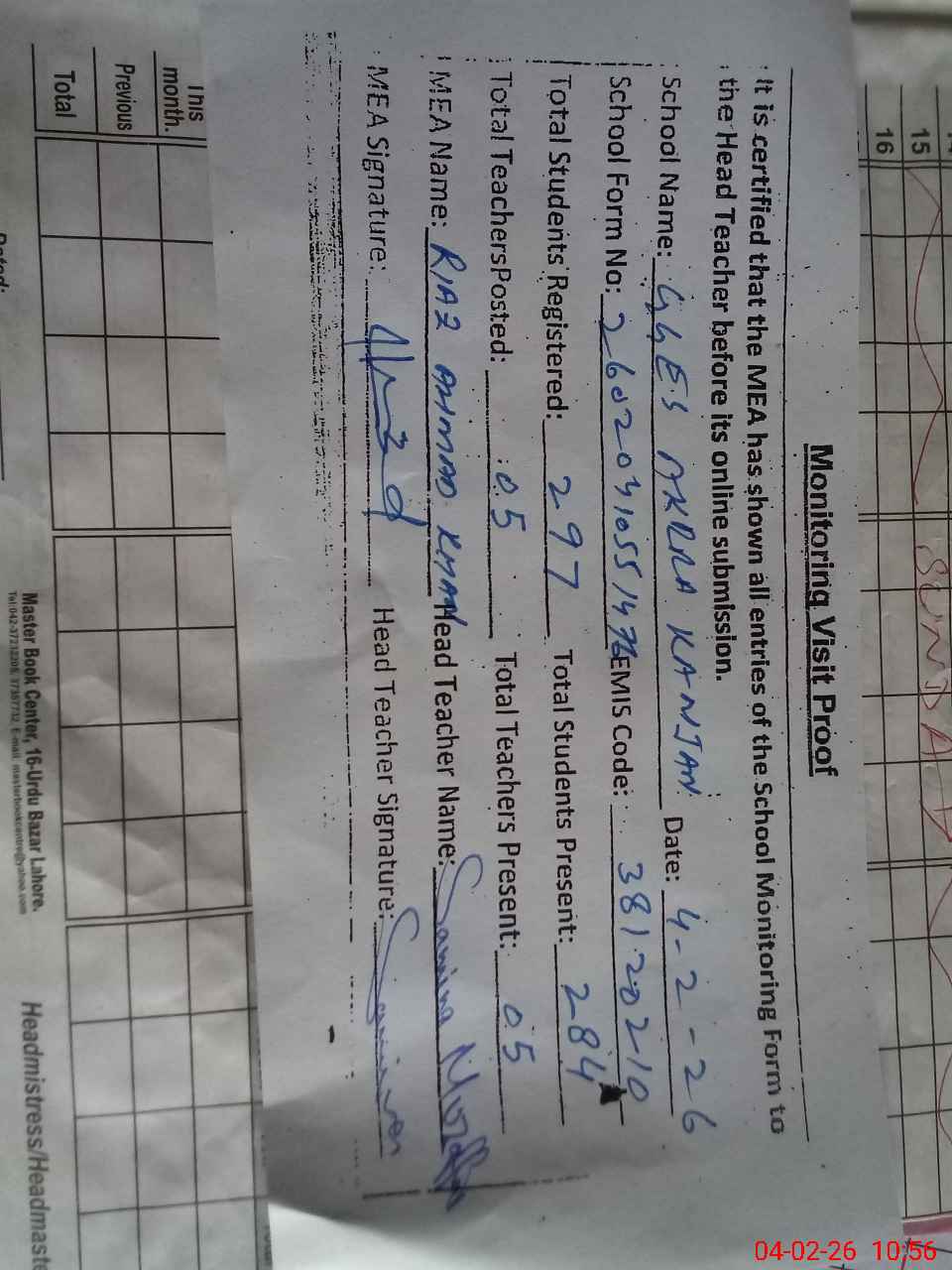 | Attendance Register | Head Teacher | MEA with School | Visit Proof |