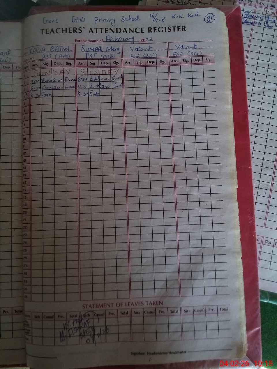 | Leave | Duty | Absent | Maternity | Medical | Ex- Pak |