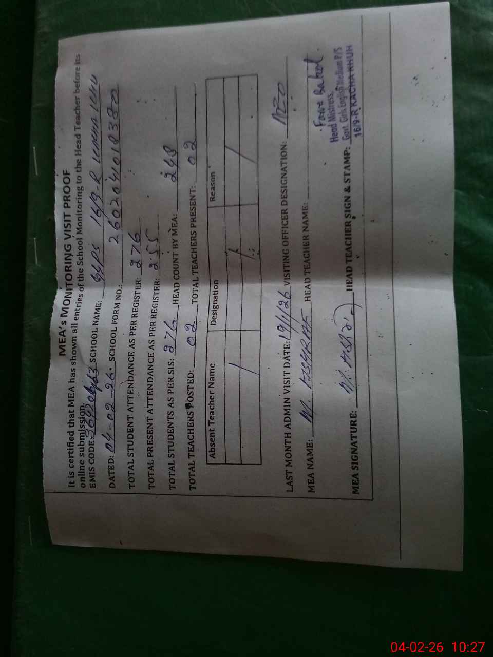 | Attendance Register | Head Teacher | MEA with School | Visit Proof |