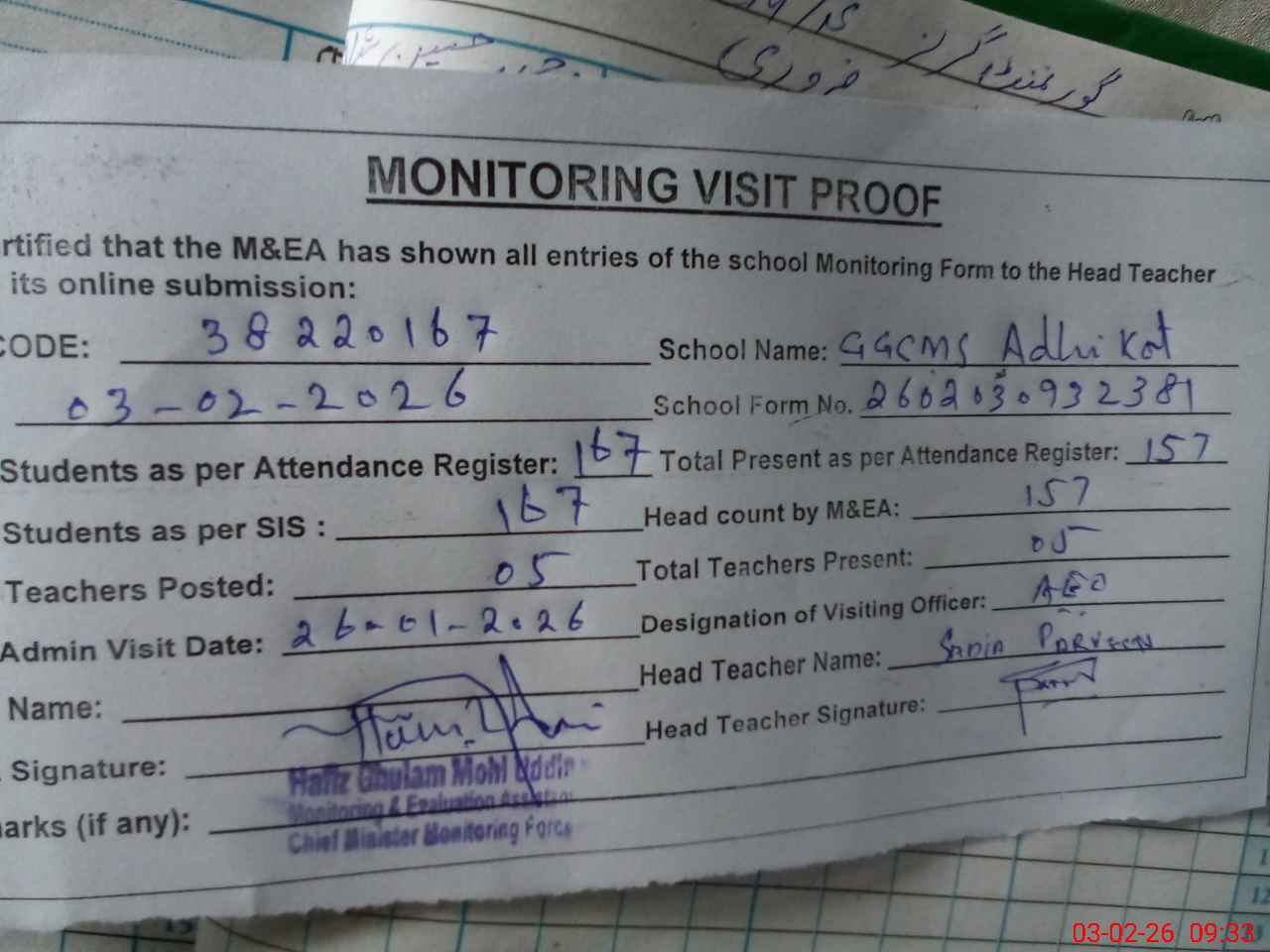| Attendance Register | Head Teacher | MEA with School | Visit Proof |