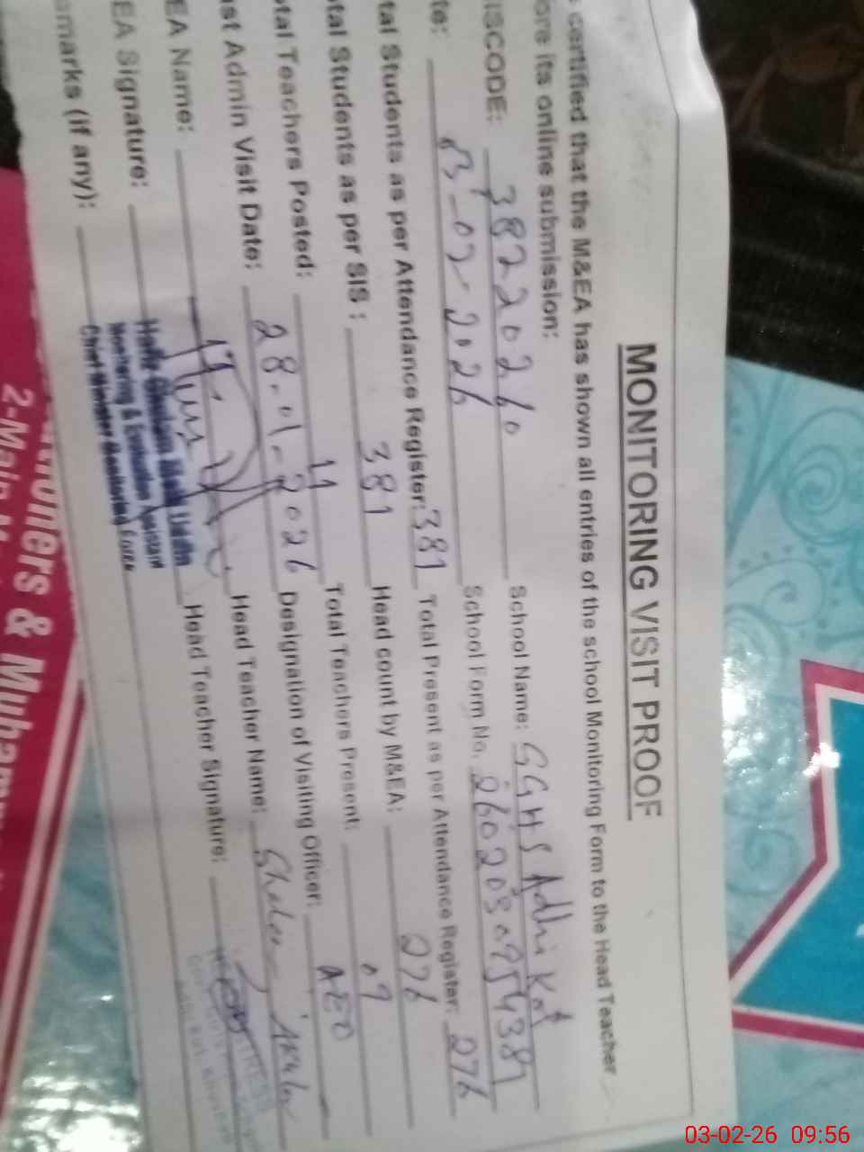 | EMIS Code: 38220260 | Name of School: GGHS ADHI KOT | |||