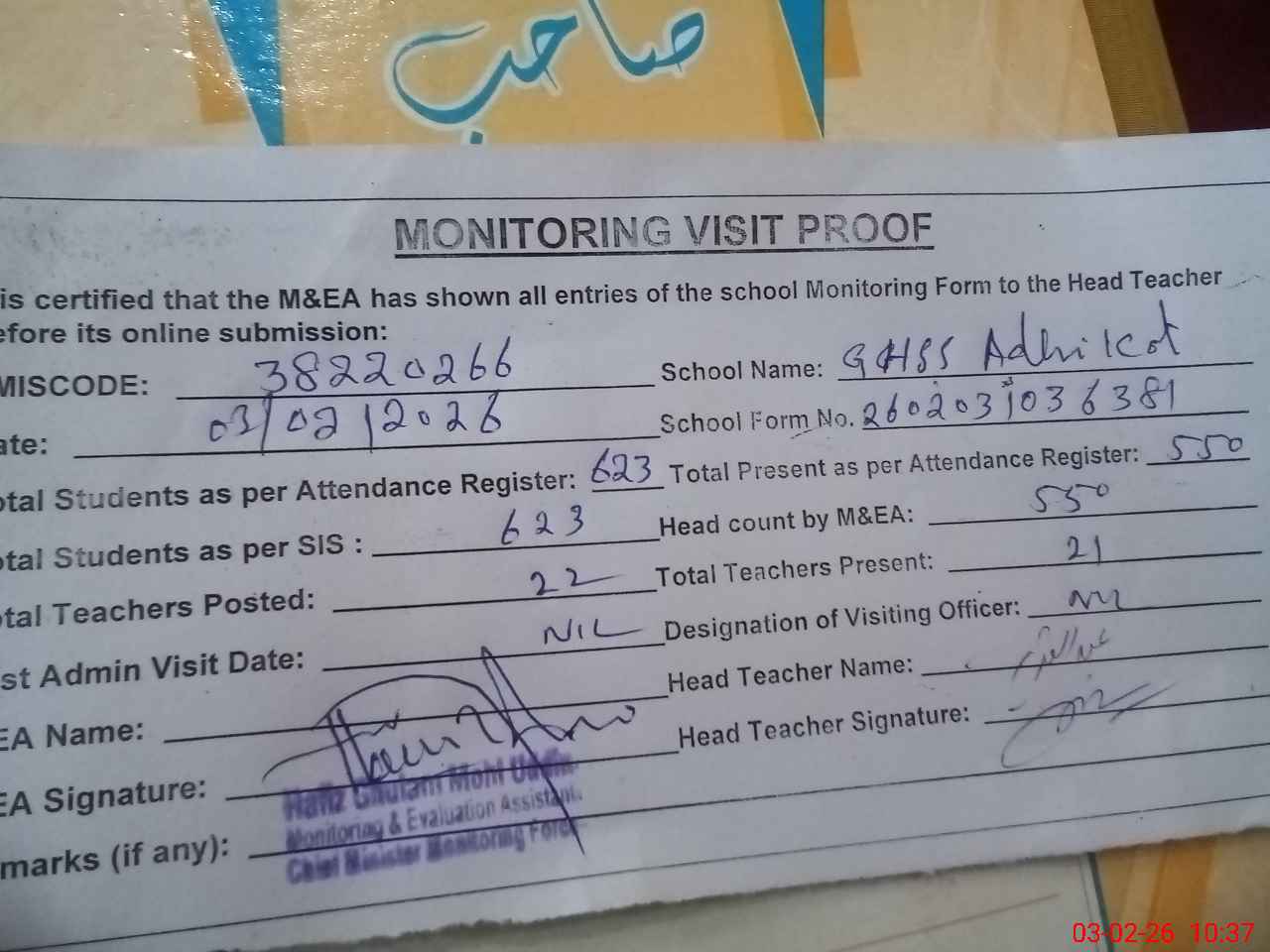 | Attendance Register | Head Teacher | MEA with School | Visit Proof |