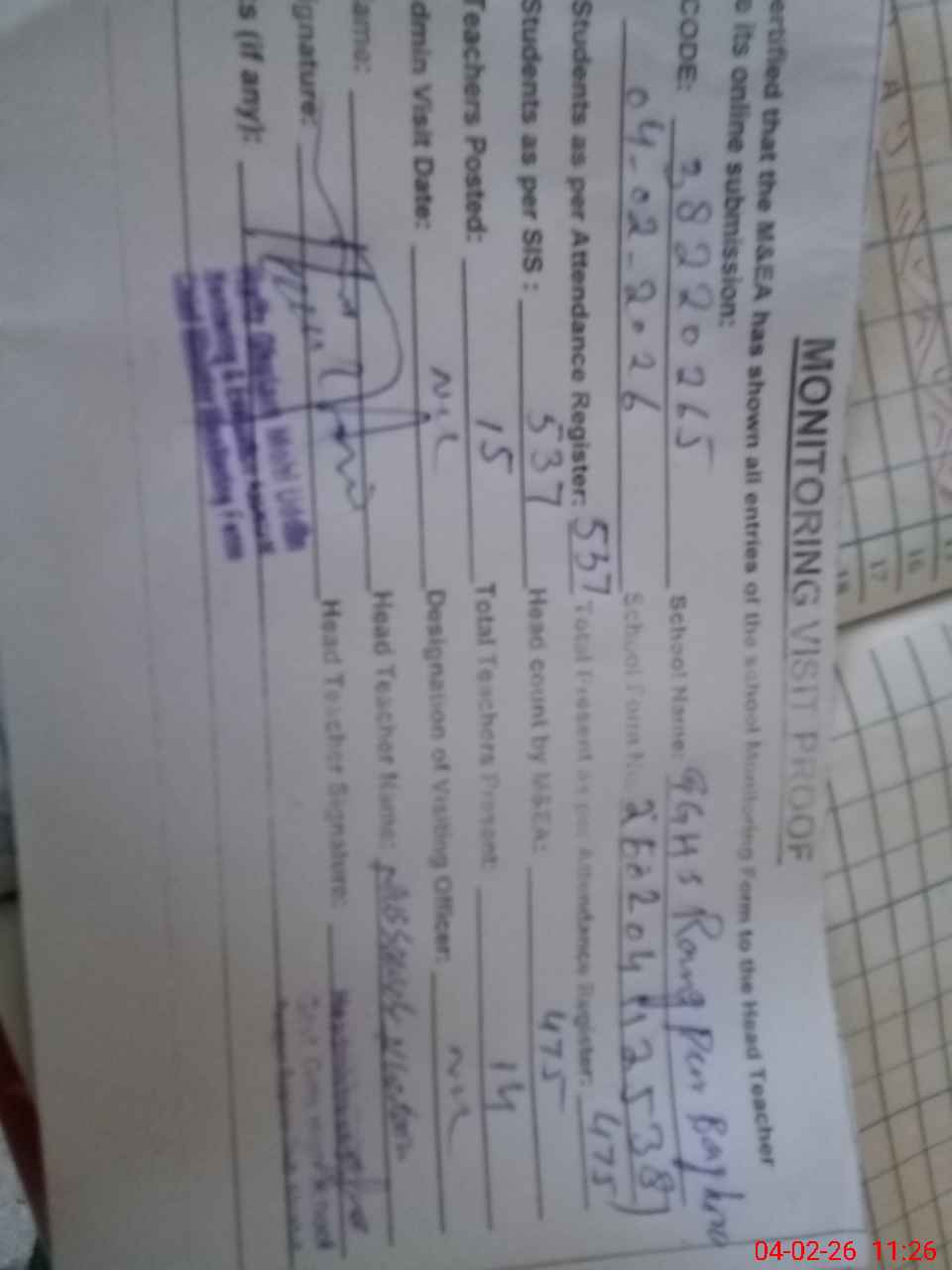 | EMIS Code: 38220265 | Name of School: GGHS RANG PUR BAGHOOR | |||