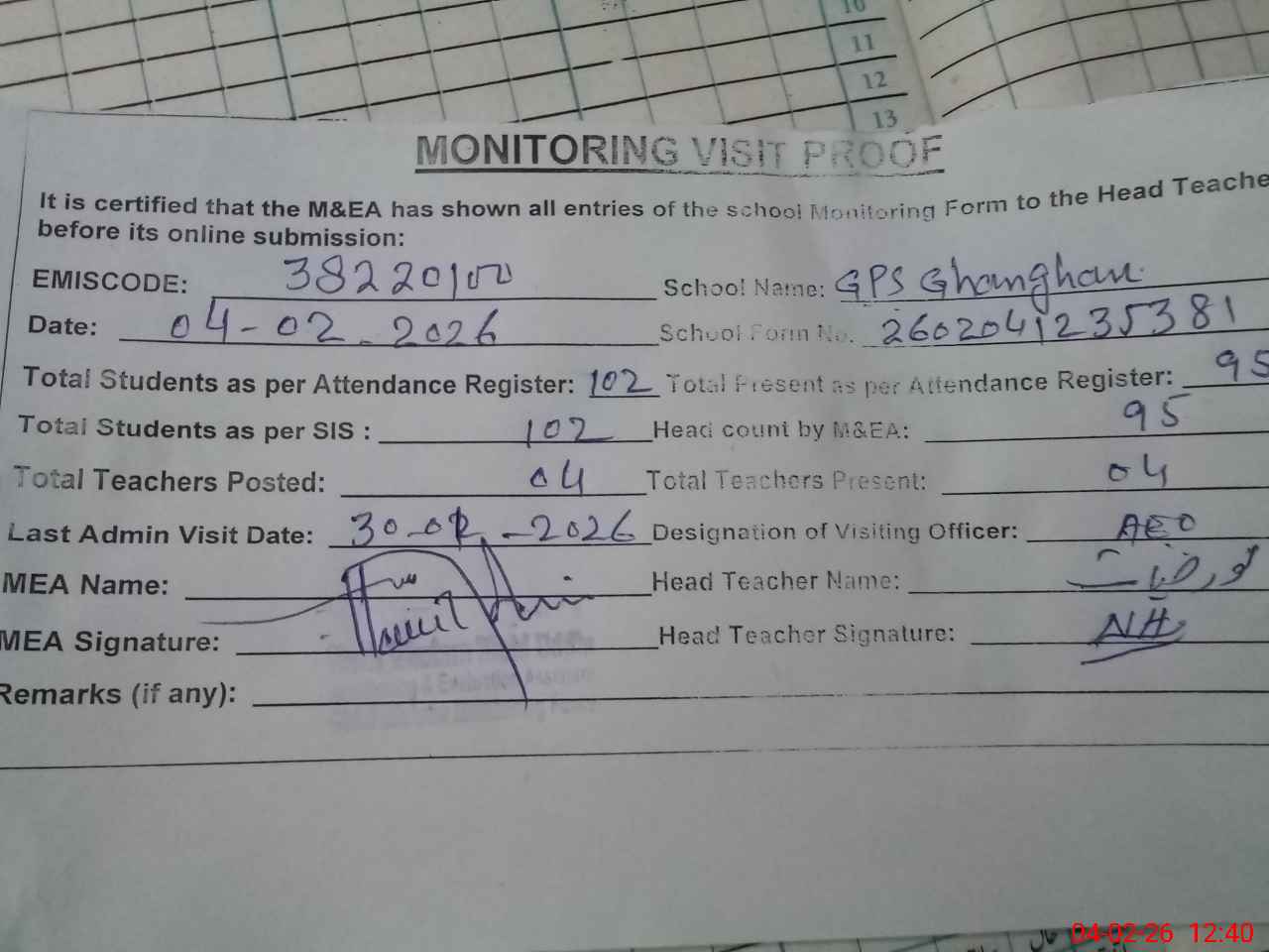 | Attendance Register | Head Teacher | MEA with School | Visit Proof |