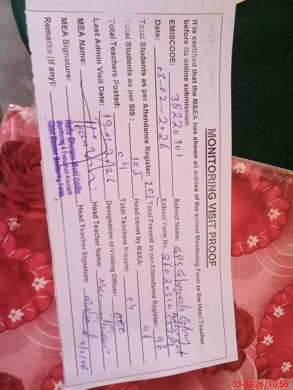 | EMIS Code: 38220101 | Name of School: GPS GHEREEB COLONY, ADHI KOT | |||
