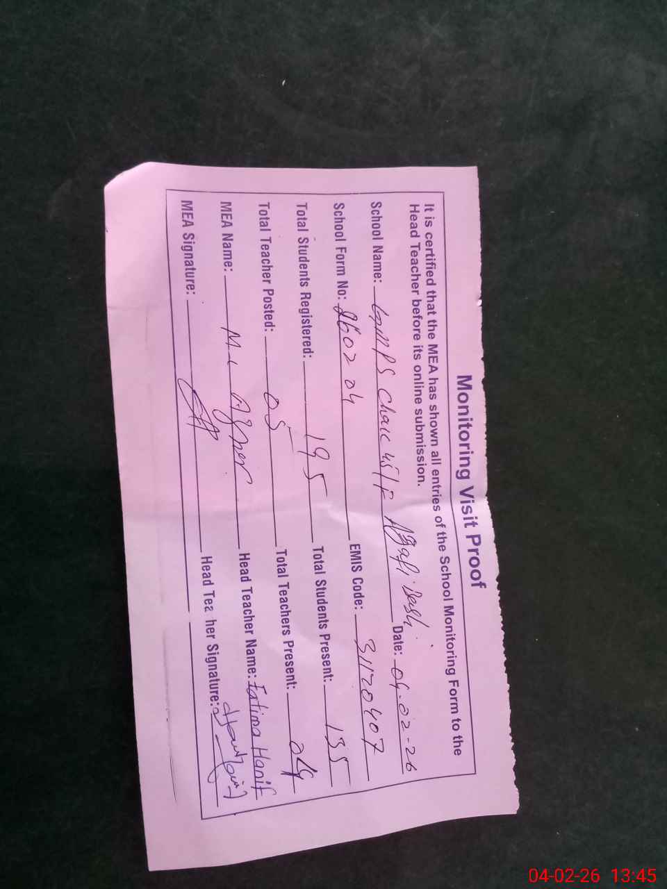 | Attendance Register | Head Teacher | MEA with School | Visit Proof |