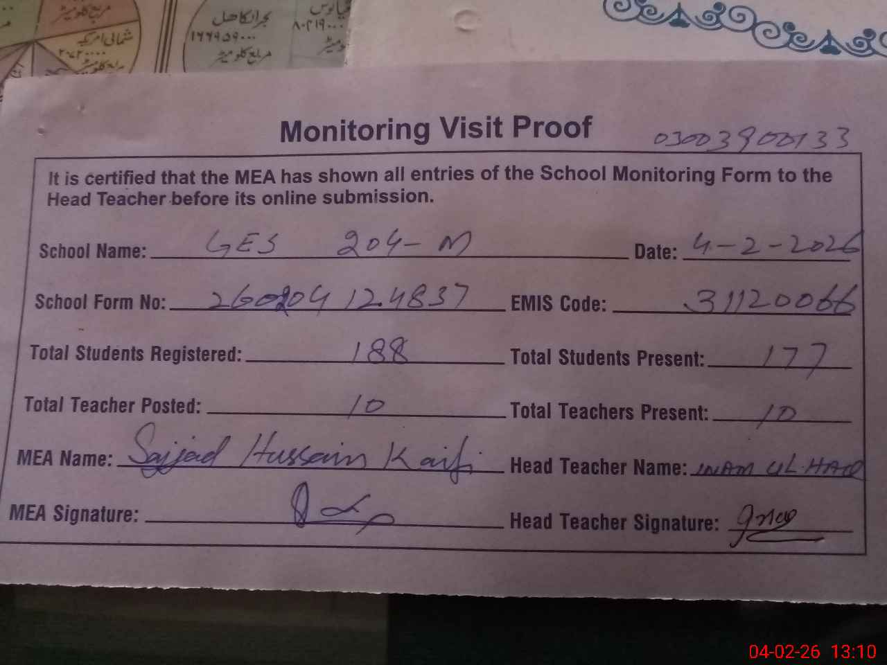 | EMIS Code: 31120066 | Name of School: GES CHAK NO. 204/M | |||
