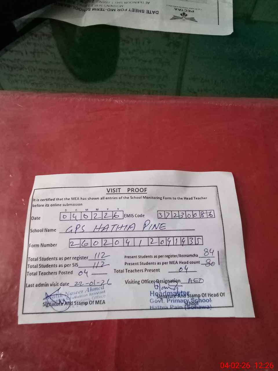 | Attendance Register | Head Teacher | MEA with School | Visit Proof |