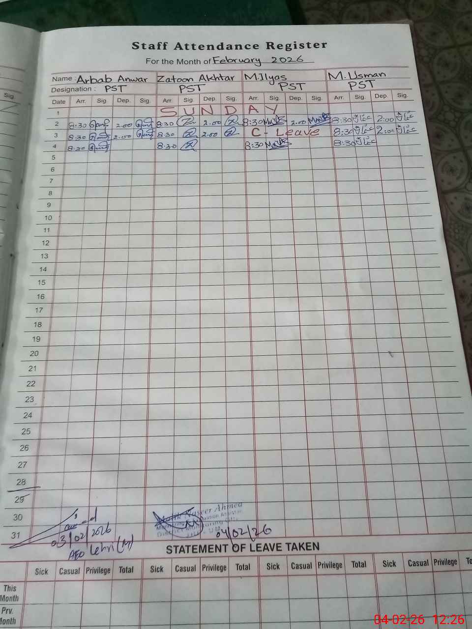 | Leave | Duty | Absent | Maternity | Medical | Ex- Pak |