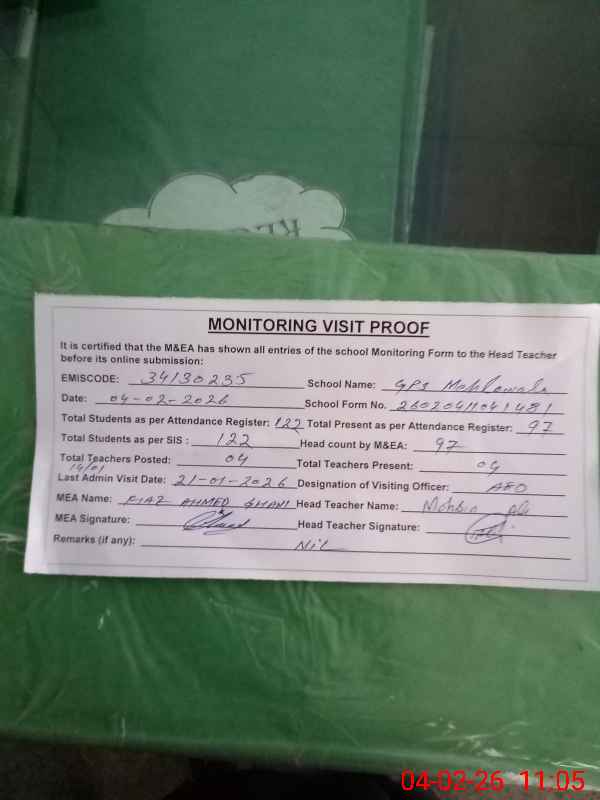 | EMIS Code: 34130235 | Name of School: GPS MEHLO WALA | |||