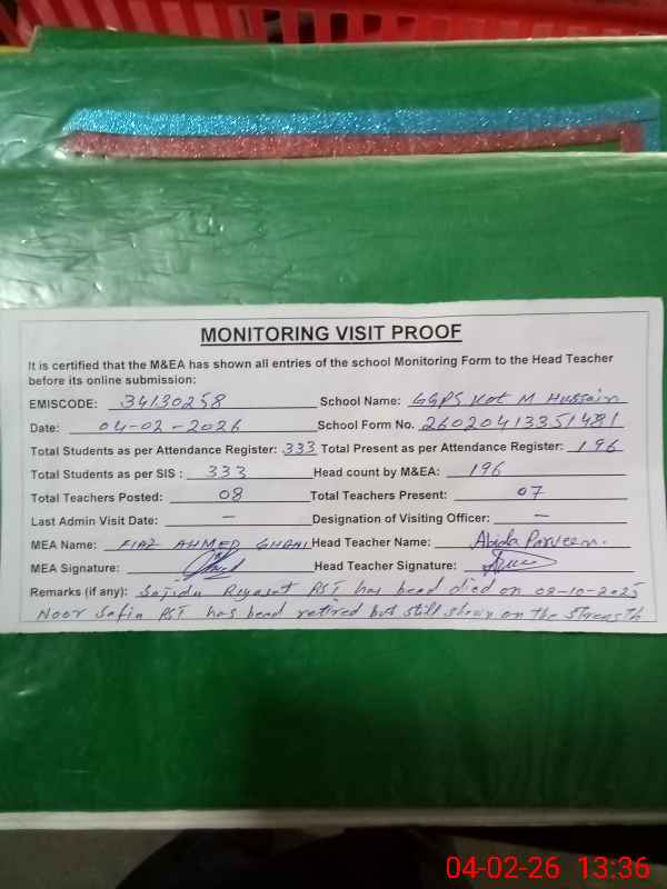 | Remarks (Use Separate Page if Required): Attendance of teaching staff and students on SIS Software is not updated Sajida Riyasat PST has been died on 08 October 2025 Noor Safia PST has been retired from service but still shown on the posted strength of this School Data as per provided by School Staff and found during physical visit | |||||