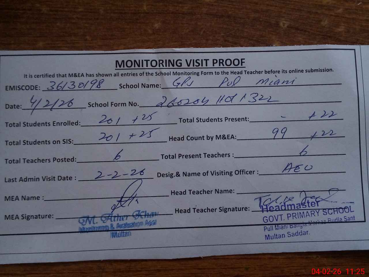 | EMIS Code: 36130198 | Name of School: GPS PUL MIANI JHOKE LASHKAR PUR | |||