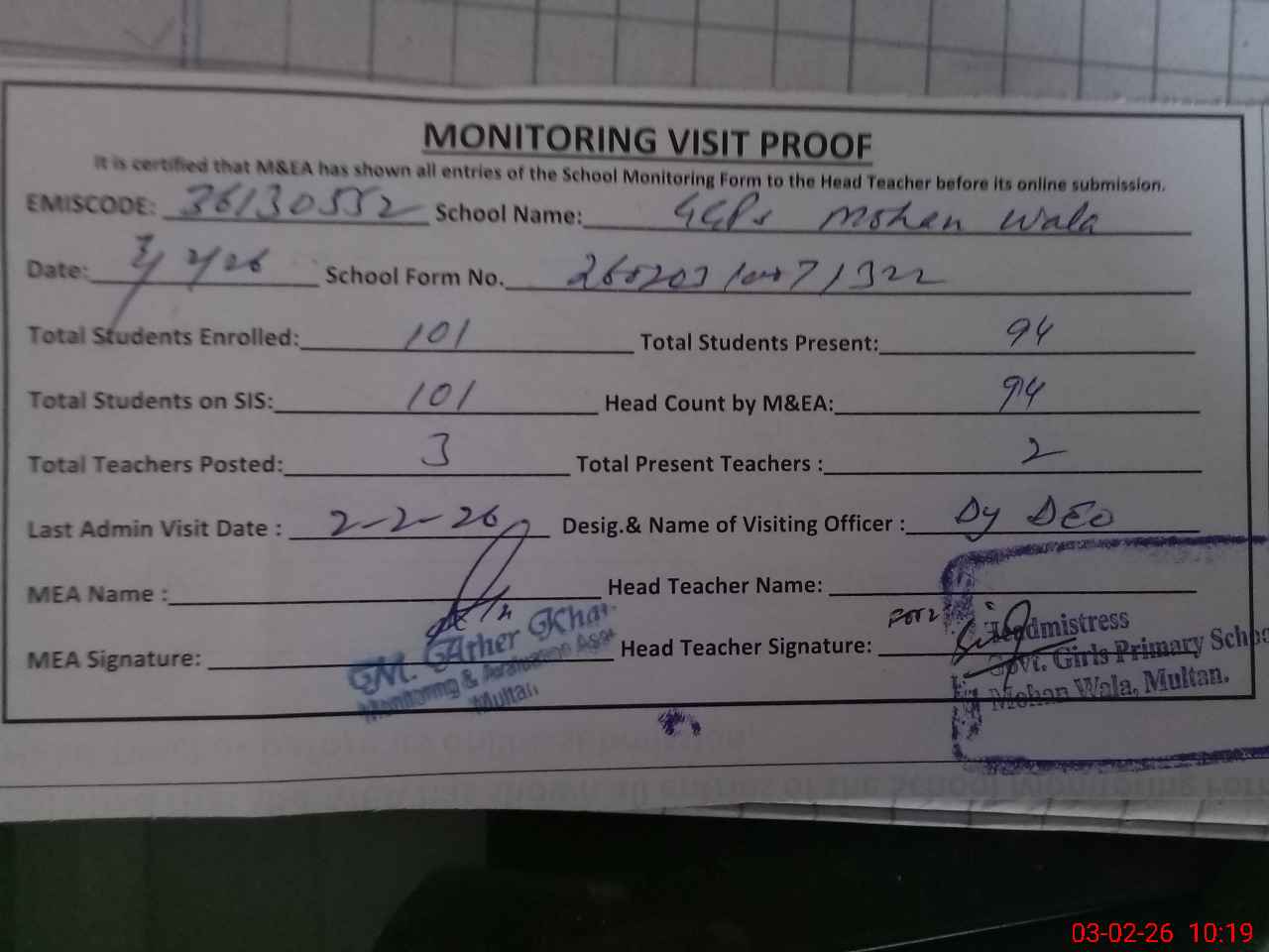 | EMIS Code: 36130552 | Name of School: GGPS MOHAN WALA MULTAN | |||