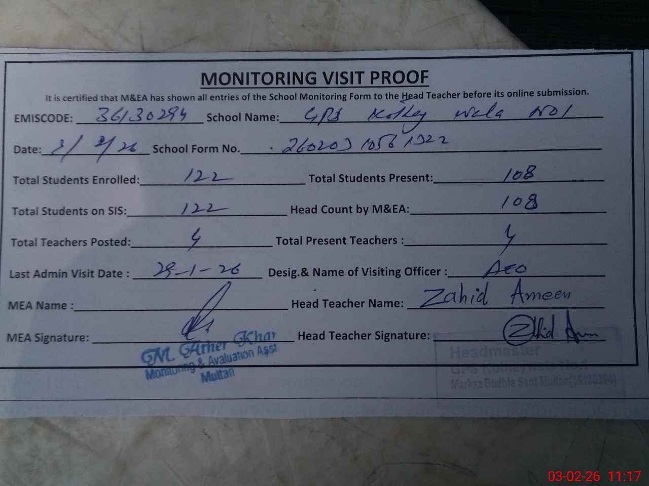 | Attendance Register | Head Teacher | MEA with School | Visit Proof |