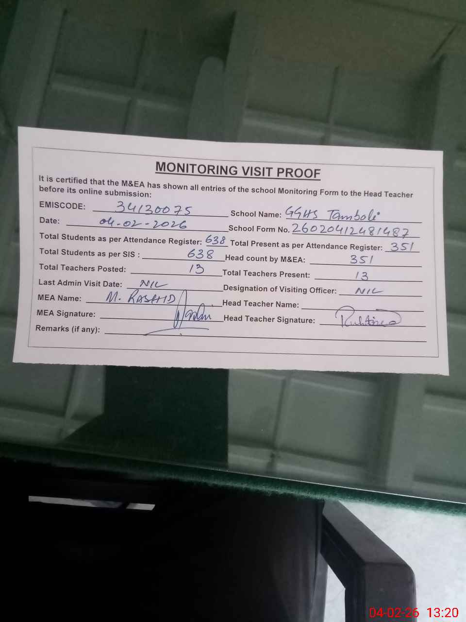 | Attendance Register | Head Teacher | MEA with School | Visit Proof |