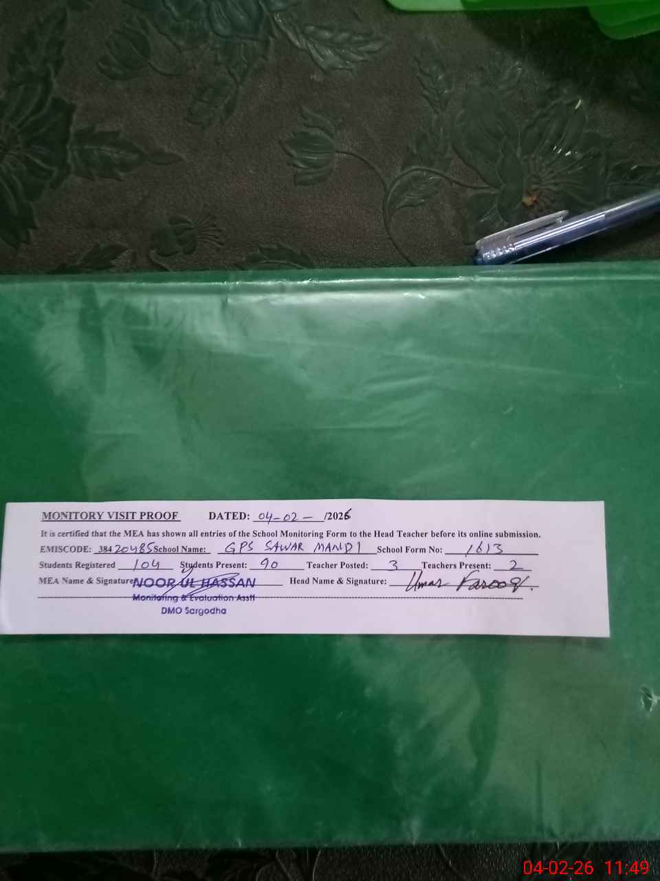 | EMIS Code: 38420485 | Name of School: GPS SAWAR MONDI CHAK NO.8 REMOUNT DEPOT | |||