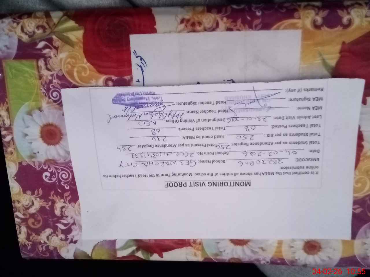 | Remarks (Use Separate Page if Required): Students on SIS Qty 250 Last admin visit On 23 January 2026 by AEO | |||||
