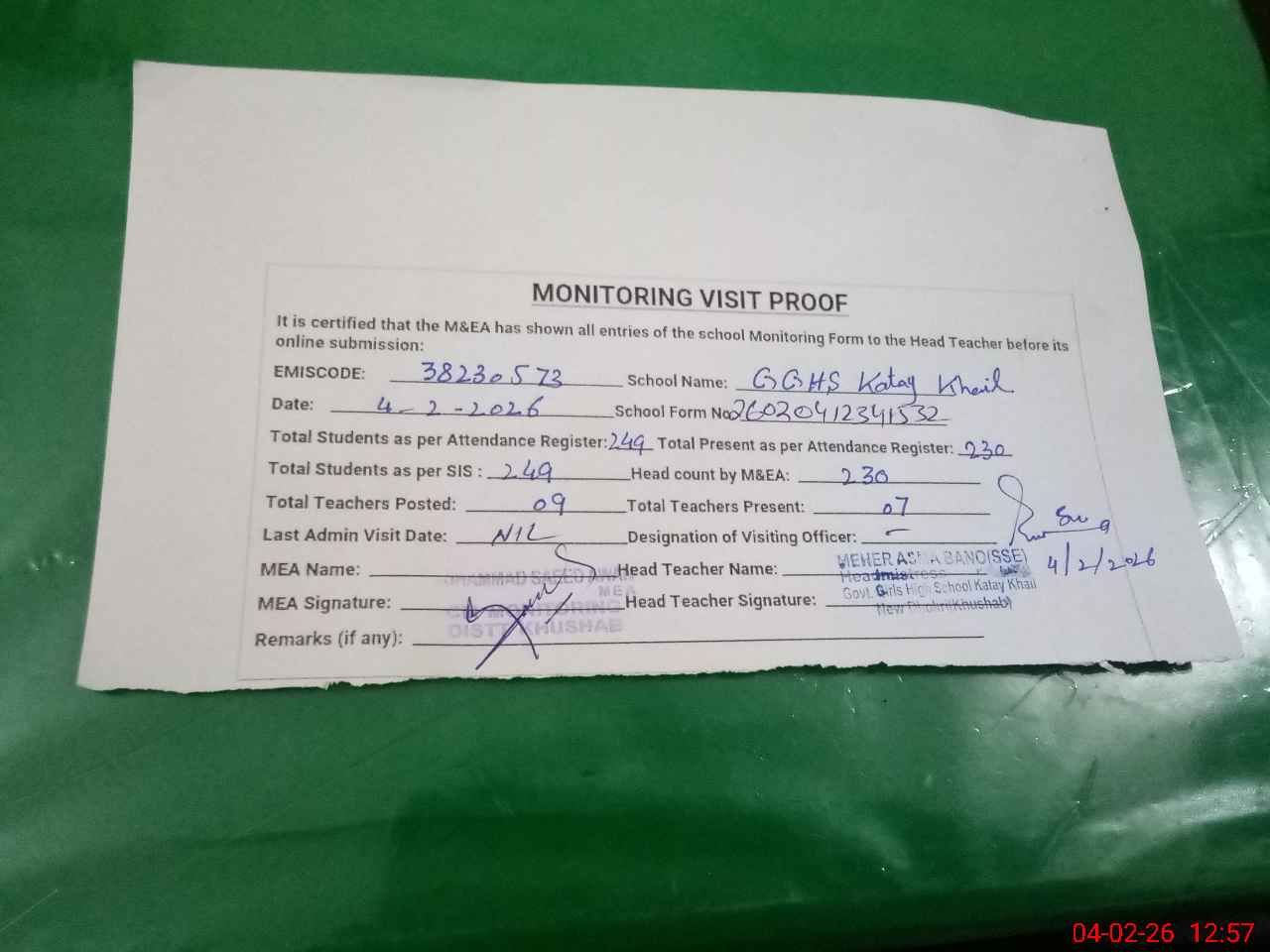 | Attendance Register | Head Teacher | MEA with School | Visit Proof |