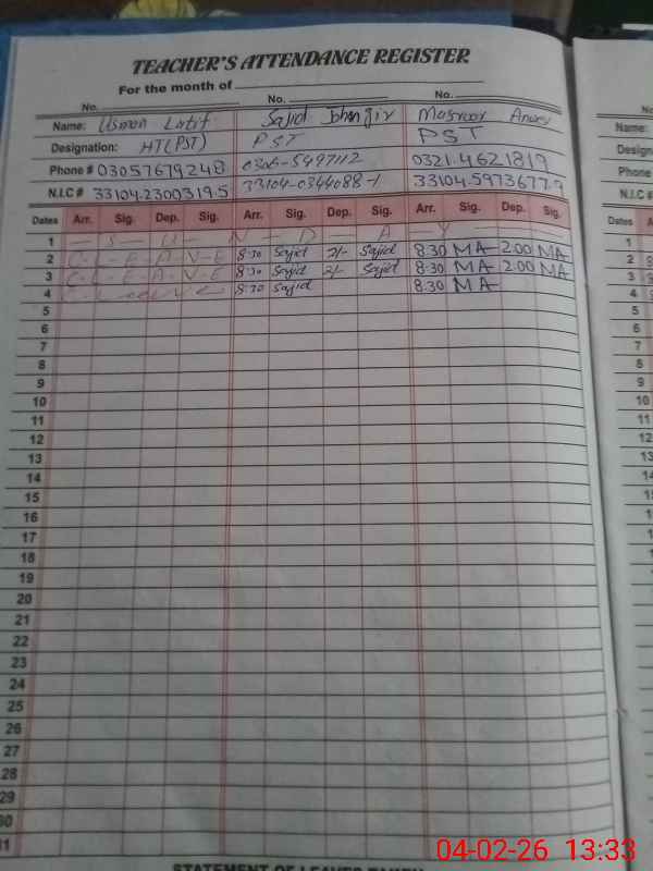 | 33**** | Mu**** Ri**** | ESE Science | Contract | 0 | 0 | 0 | 0 | 0 | 0 | 0 | 0 | 0 | Absent (Un-Authorized) |