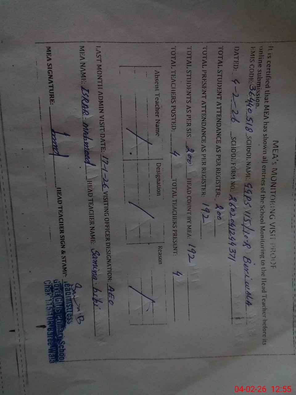 | Attendance Register | Head Teacher | MEA with School | Visit Proof |