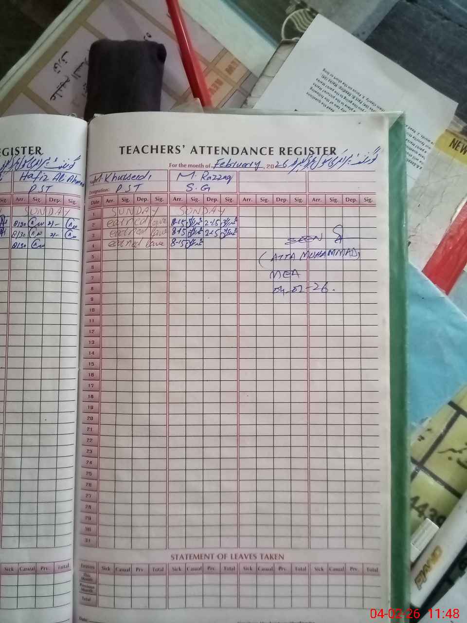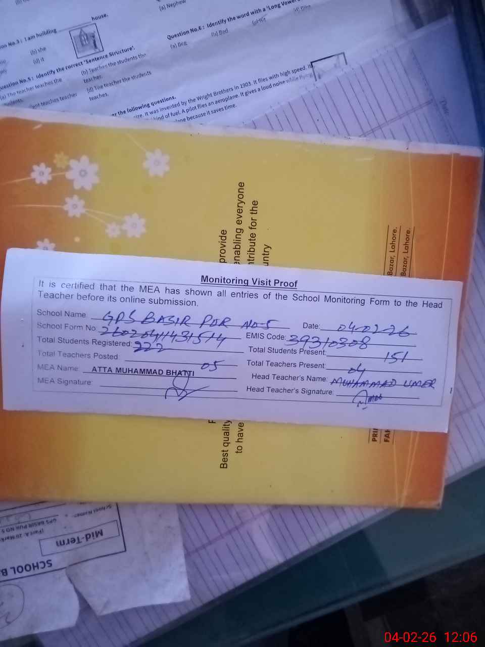 | Attendance Register | Head Teacher | MEA with School | Visit Proof |