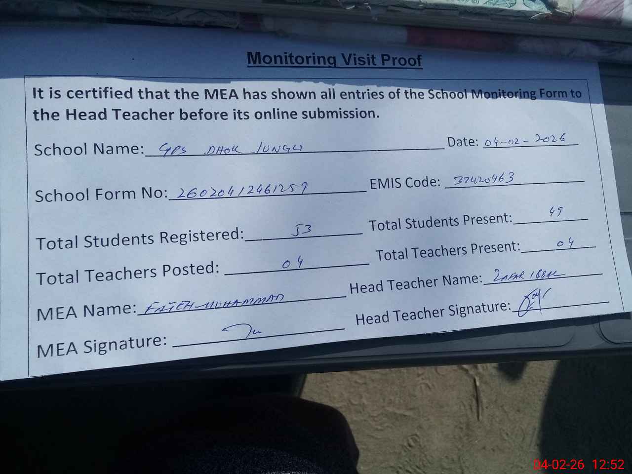 | Attendance Register | Head Teacher | MEA with School | Visit Proof |