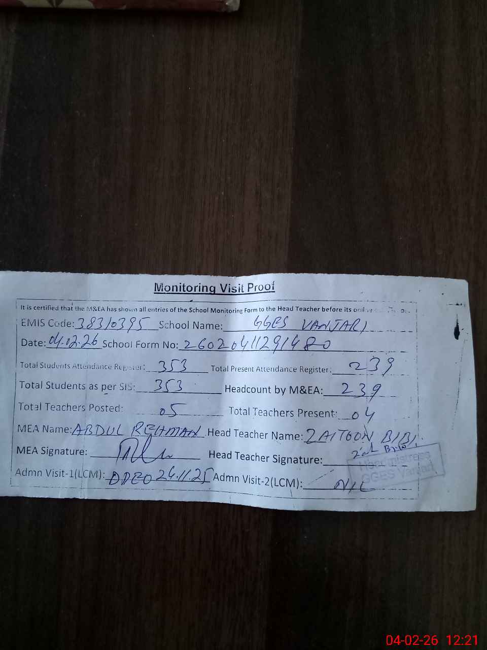 | Attendance Register | Head Teacher | MEA with School | Visit Proof |