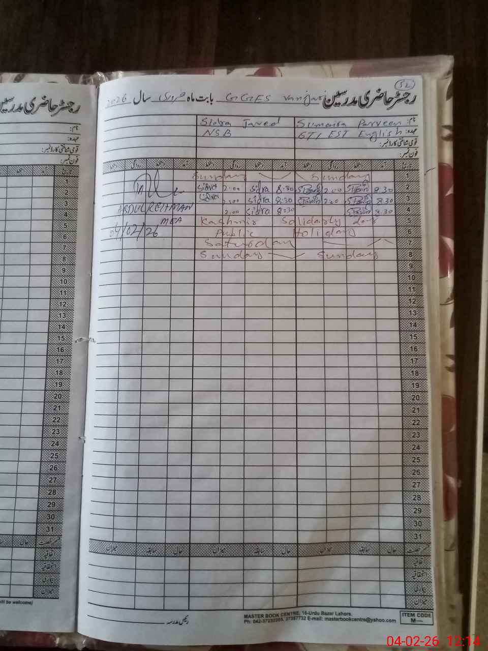 | CNIC | Full Name | Designation | R/C | Absence During Last Calender Month |