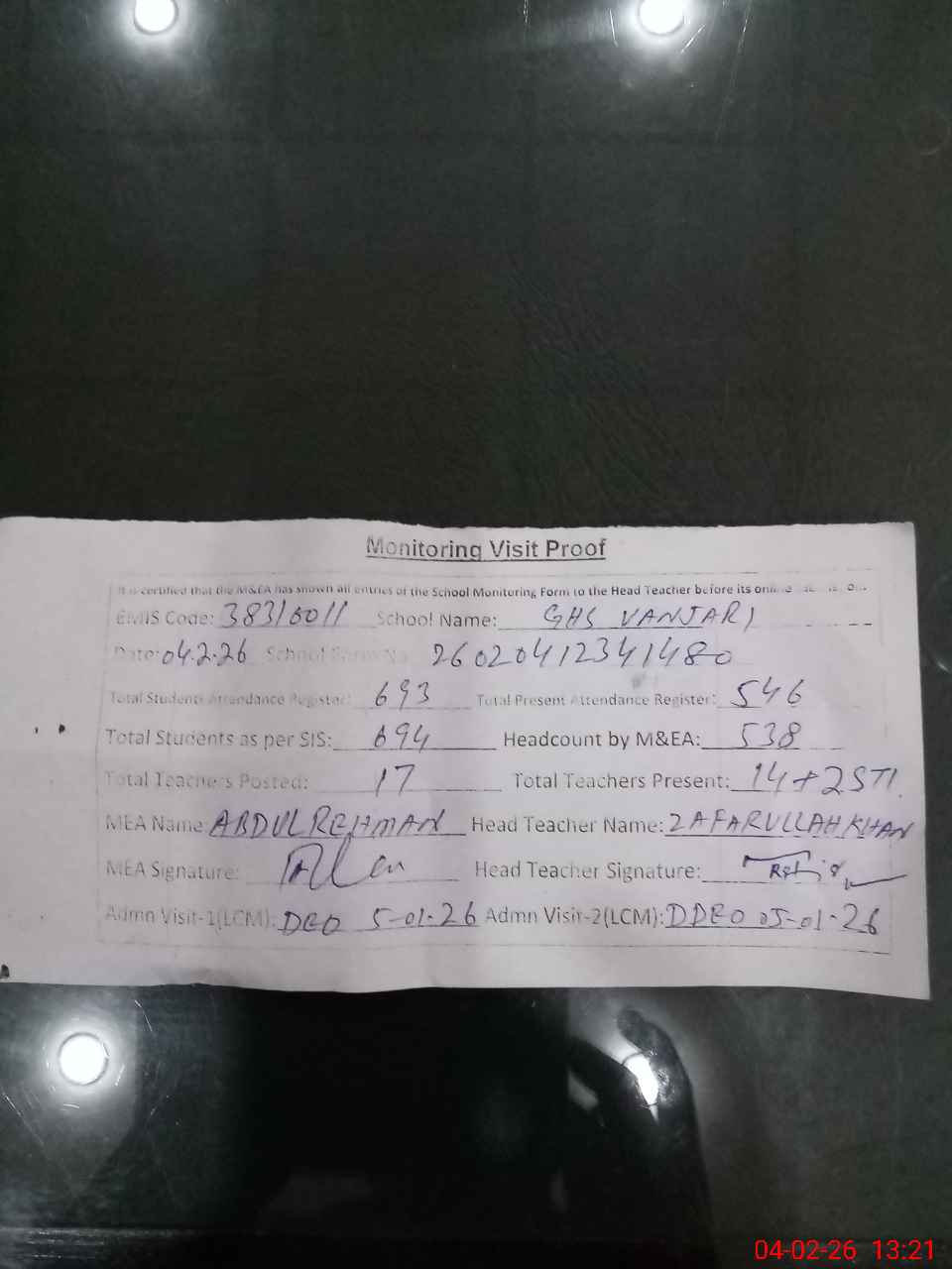 | EMIS Code: 38310011 | Name of School: GHS VANJARI | |||