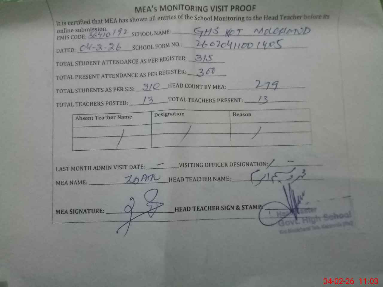| Attendance Register | Head Teacher | MEA with School | Visit Proof |