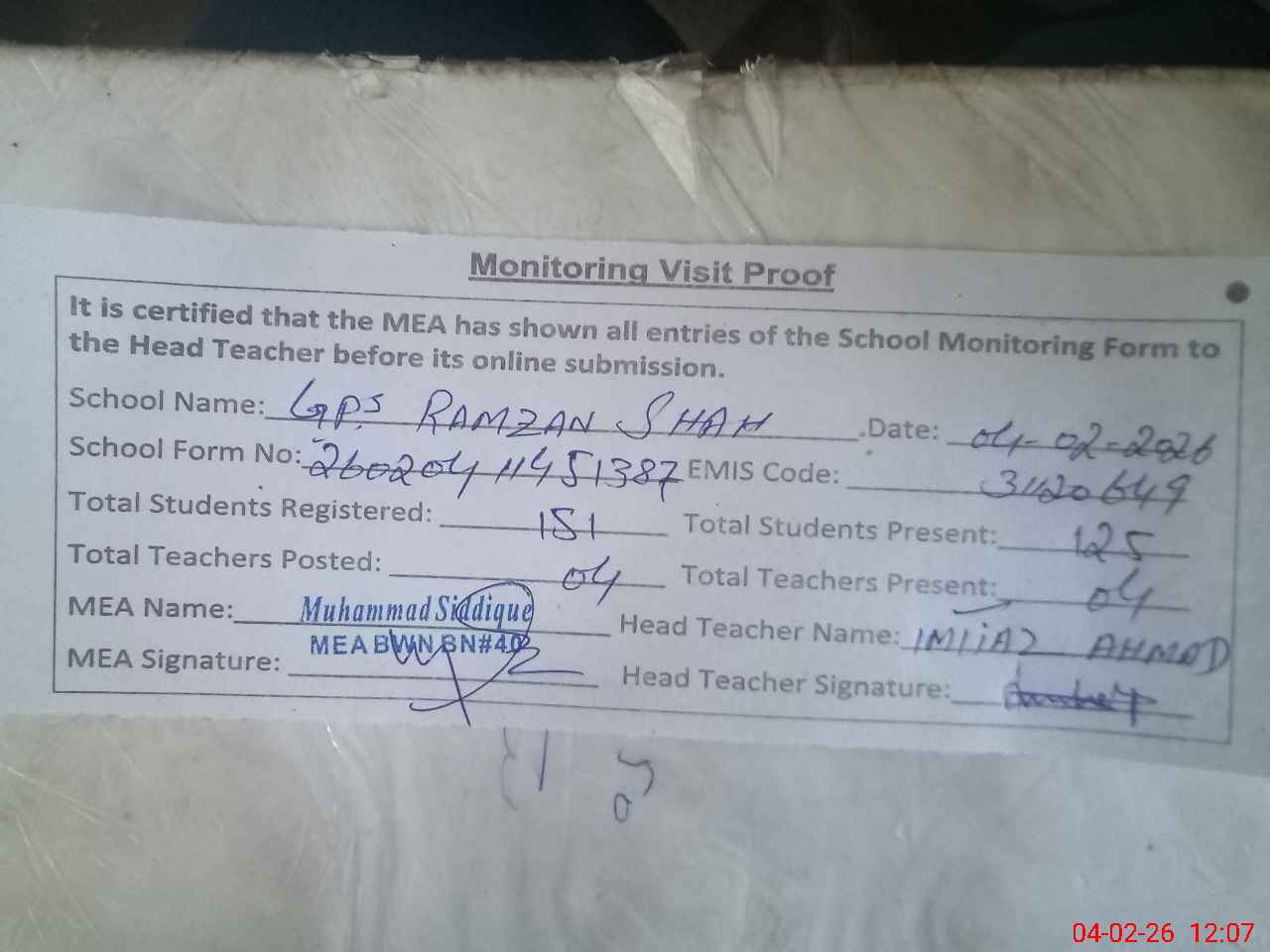 | EMIS Code: 31120649 | Name of School: GPS RAMZAN SHAH | |||