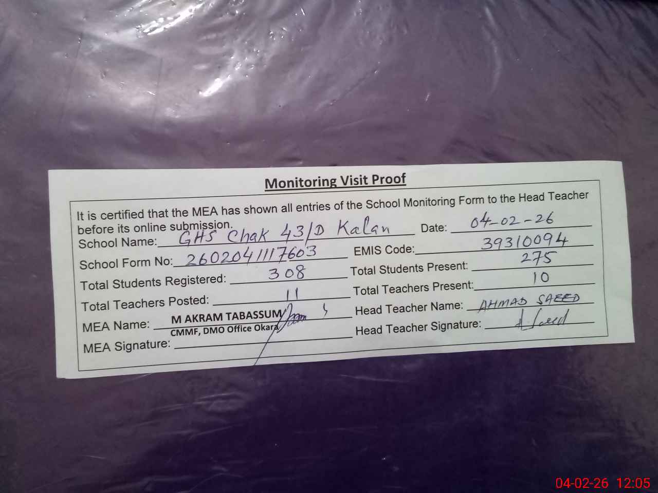 | Attendance Register | Head Teacher | MEA with School | Visit Proof |