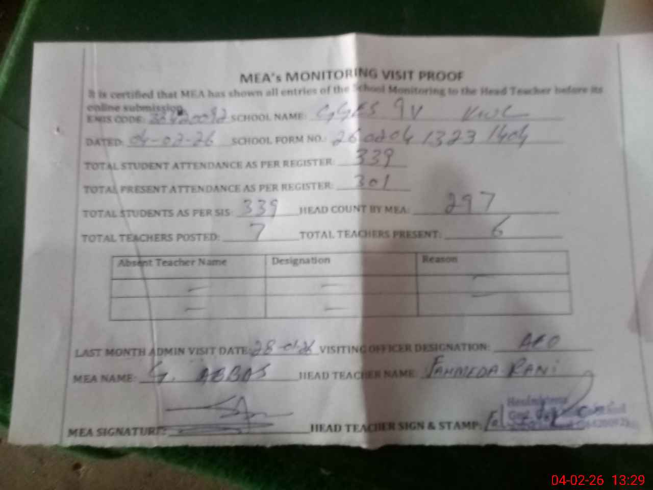 | Attendance Register | Head Teacher | MEA with School | Visit Proof |