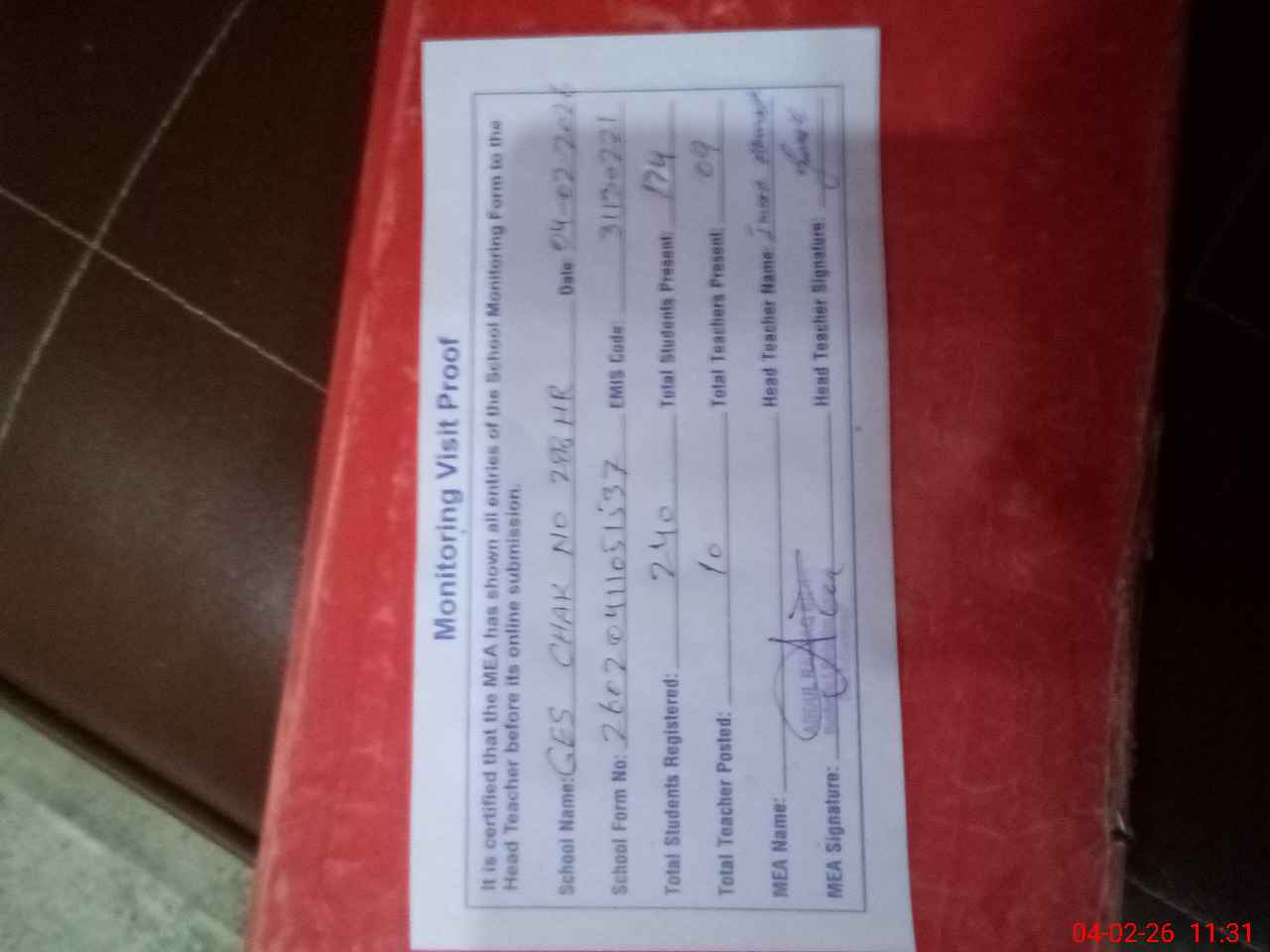 | Attendance Register | Head Teacher | MEA with School | Visit Proof |