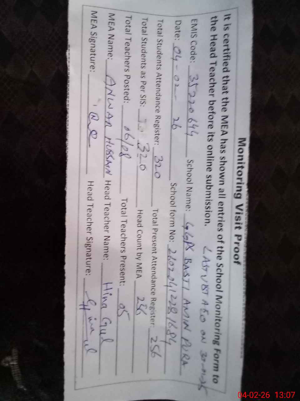 | Attendance Register | Head Teacher | MEA with School | Visit Proof |