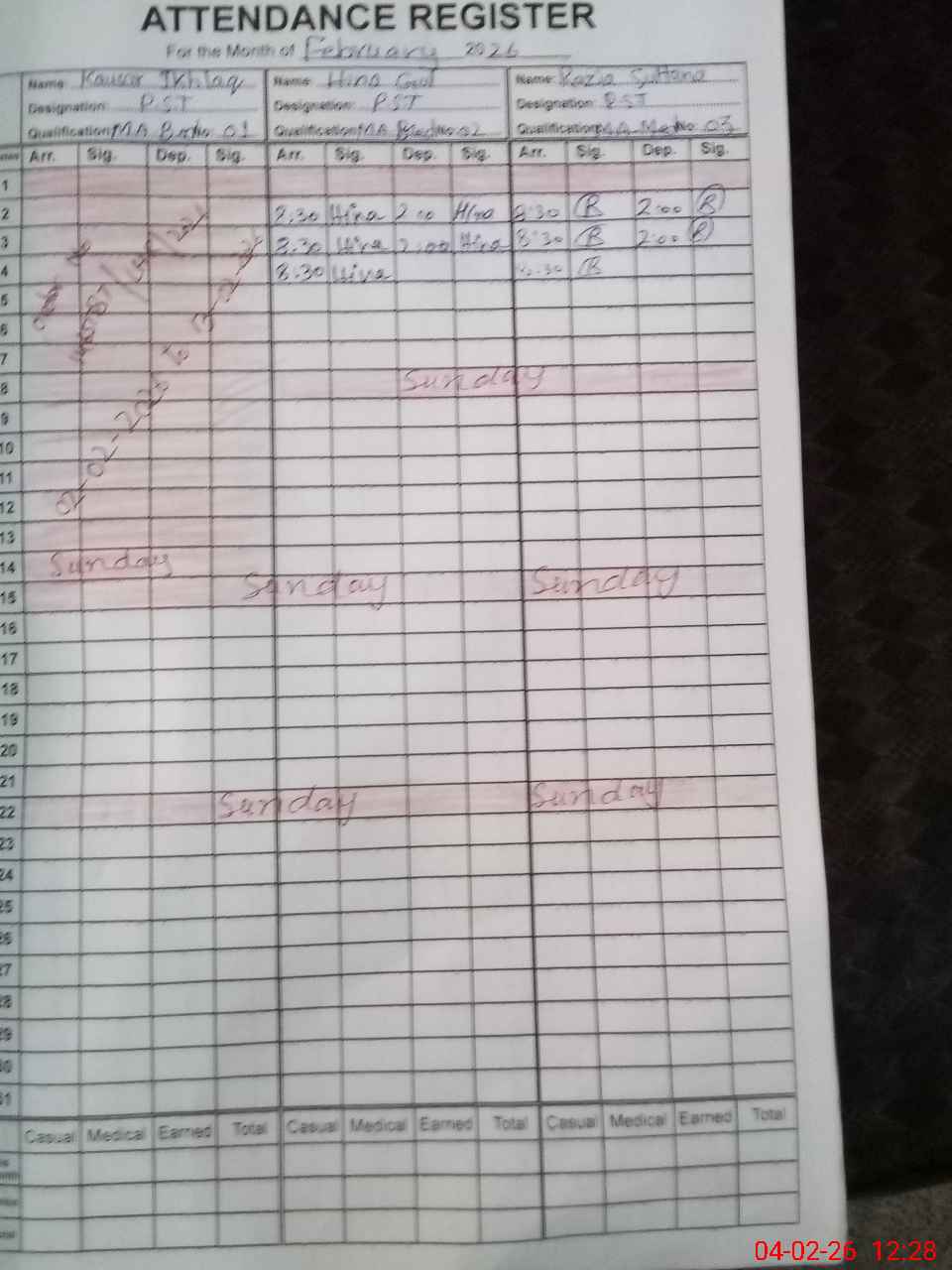 | CNIC | Full Name | Designation | R/C | Absence During Last Calender Month |