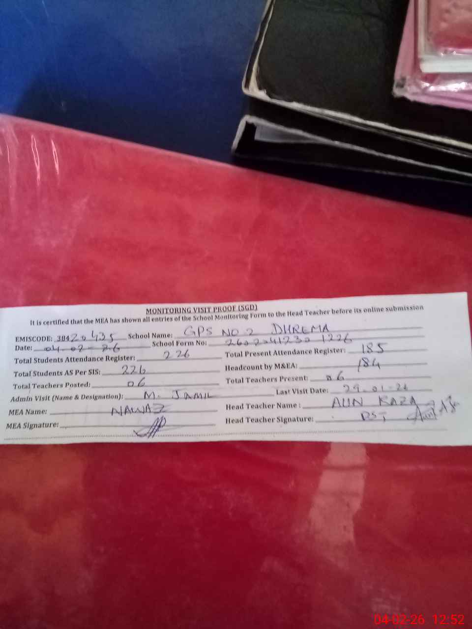 | Attendance Register | Head Teacher | MEA with School | Visit Proof |