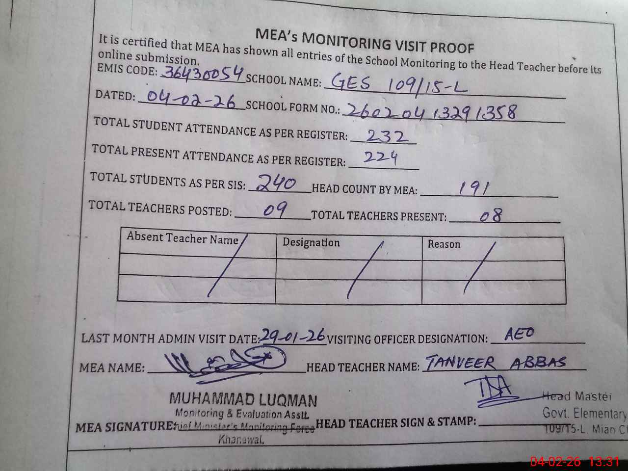| Attendance Register | Head Teacher | MEA with School | Visit Proof |