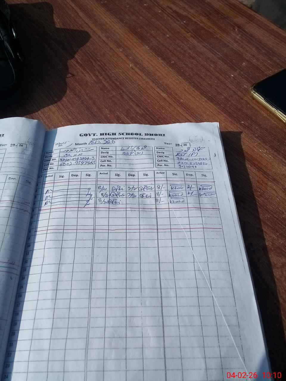 | CNIC | Full Name | Designation | R/C | Absence during last cal. month |