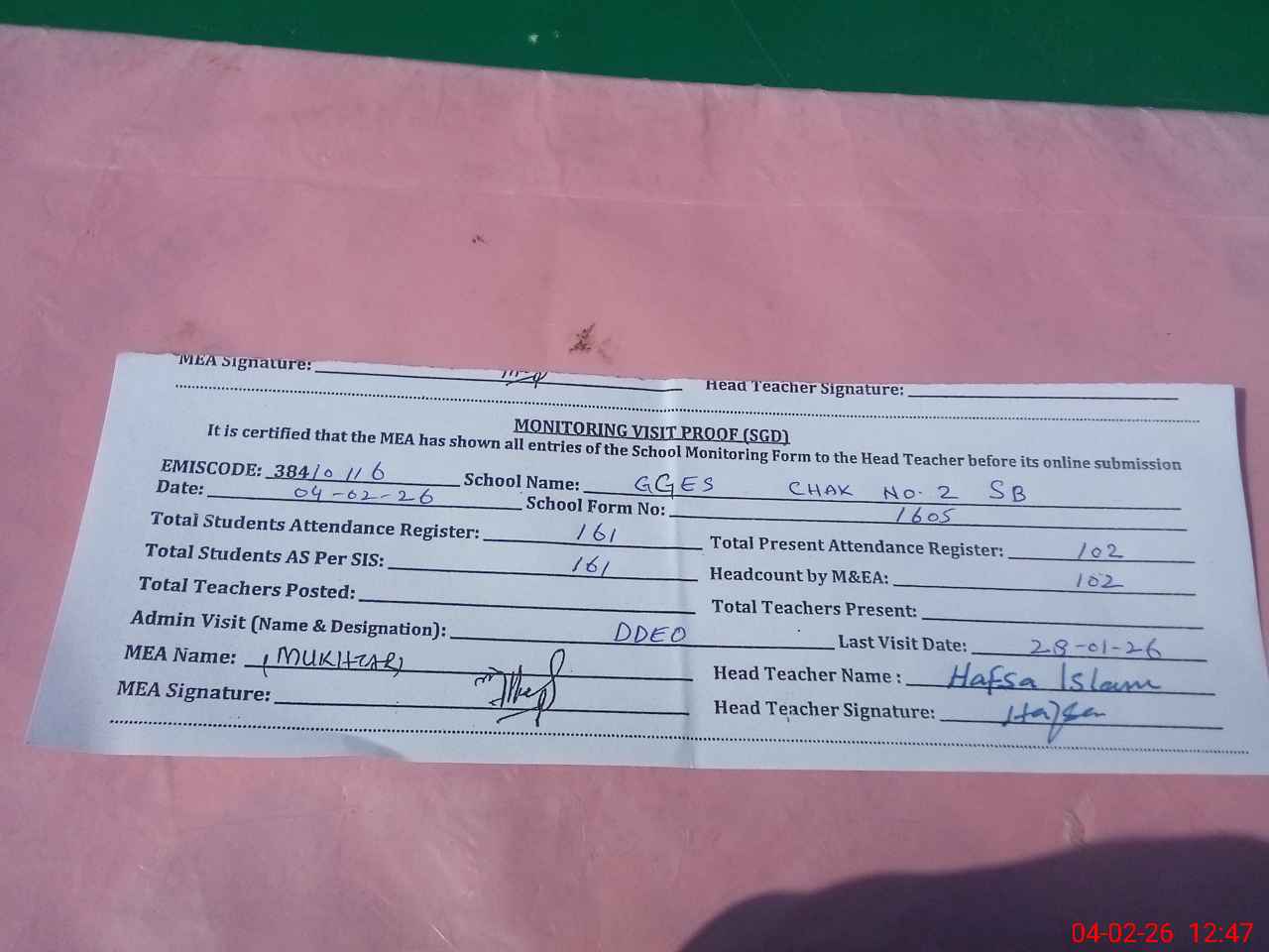 | EMIS Code: 38410116 | Name of School: GGES CHAK NO.2 SB | |||