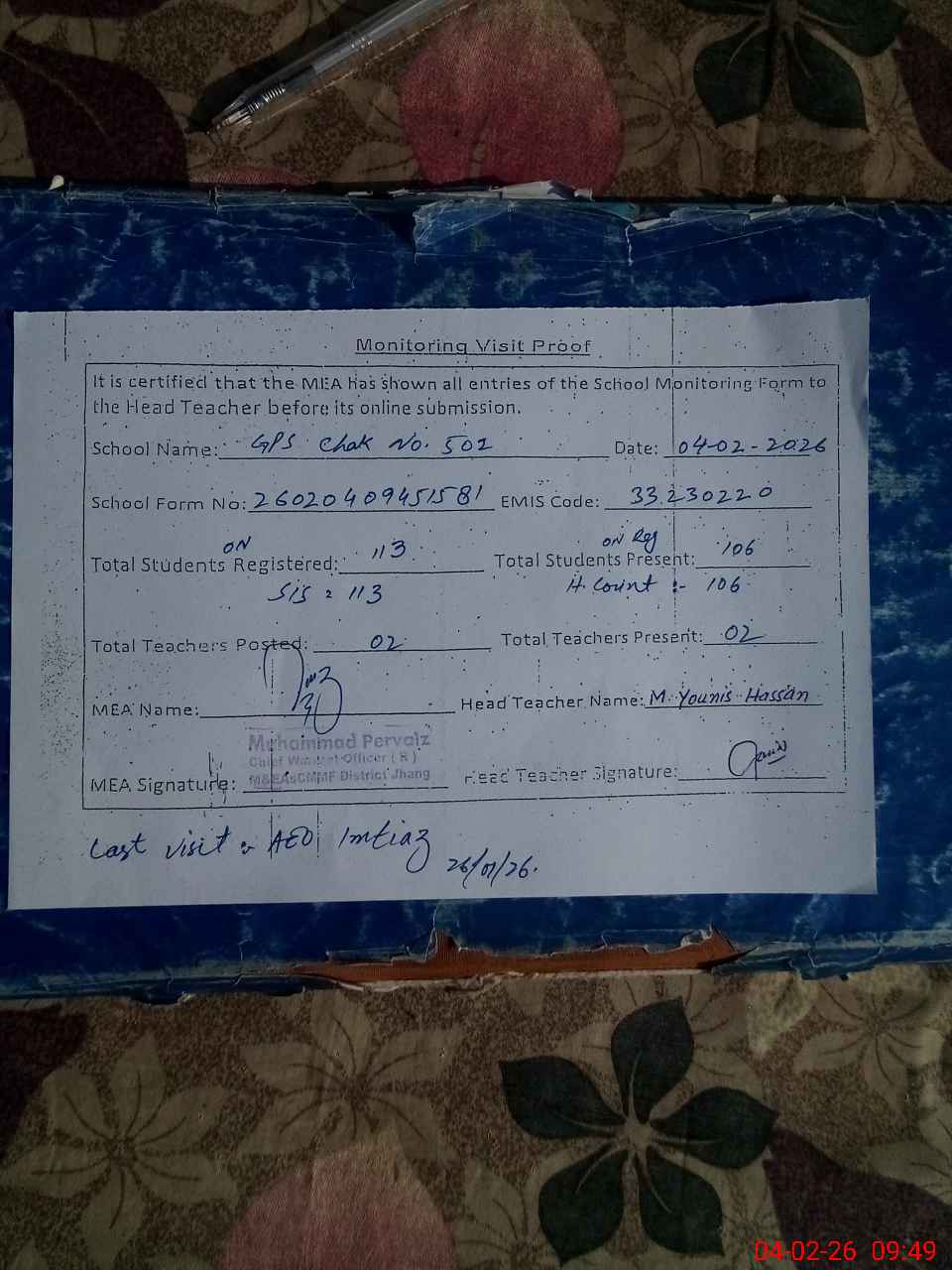| EMIS Code: 33230220 | Name of School: GPS CHAK NO 502 JB | |||