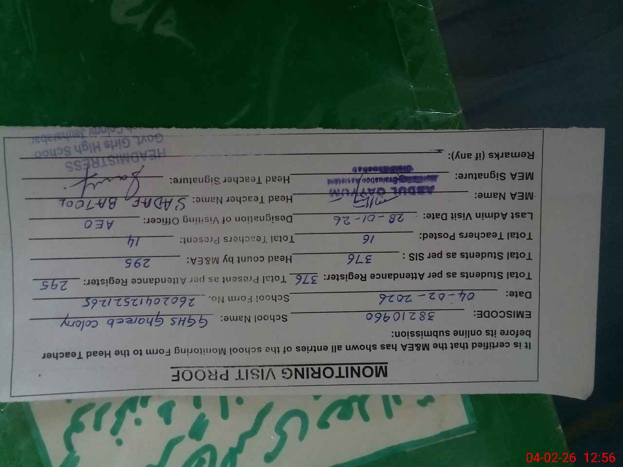 | Remarks (Use Separate Page if Required): shortage of class 4 .total 4 class 4 were working in gghs ghareeb colony.one has passed away.one is on duty onADC ((G) .one is clerk .only one class 4 is there for whole high school work. | |||||