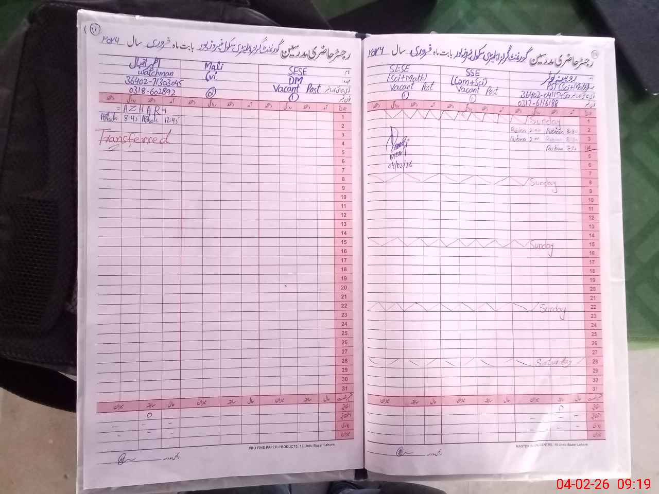 | CNIC | Full Name | Designation | R/C | Absence During Last Calender Month |