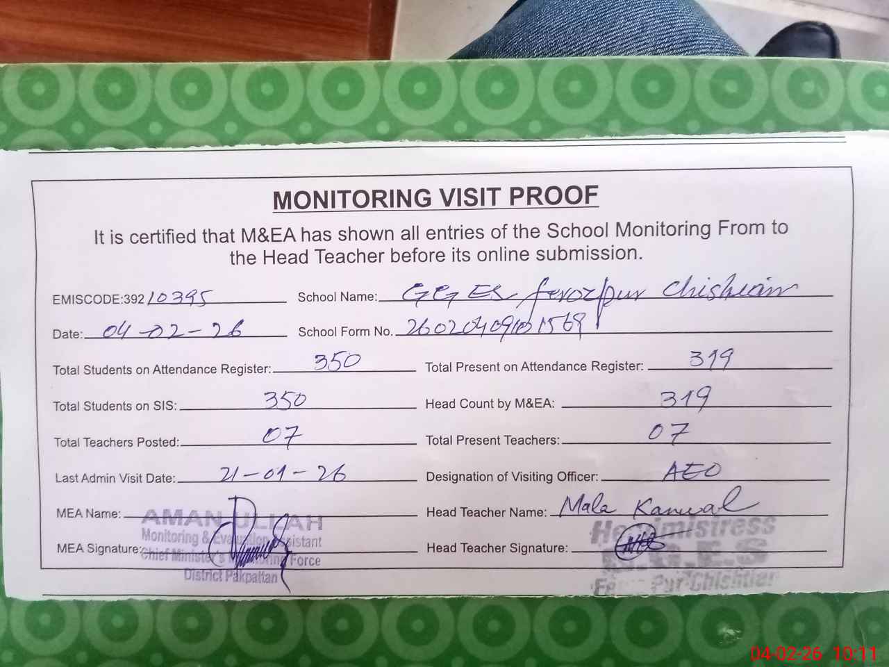 | Attendance Register | Head Teacher | MEA with School | Visit Proof |