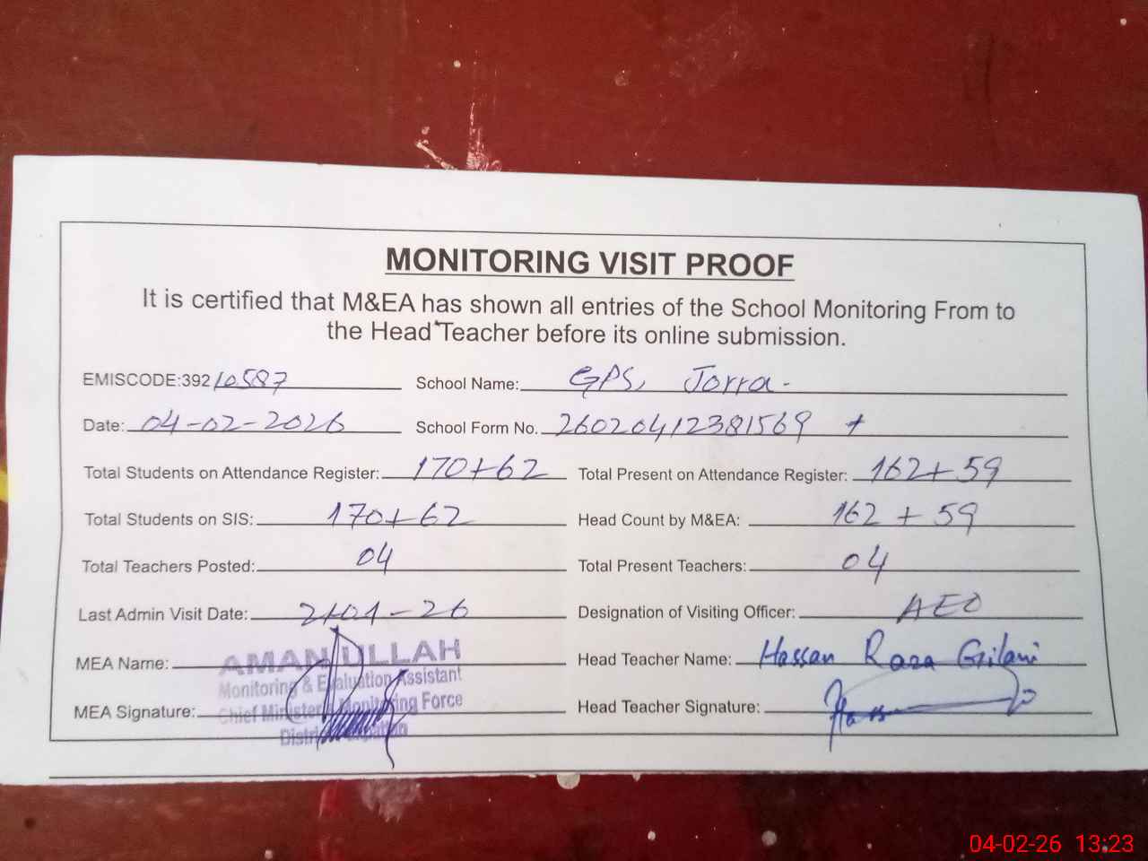 | Attendance Register | Head Teacher | MEA with School | Visit Proof |